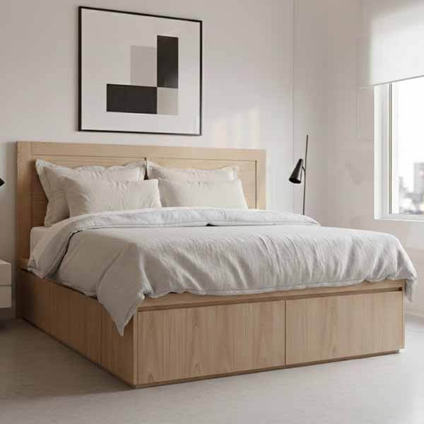 Cama Fabricada en madera de paraiso con terminacion poliuretanica. Disponible toda blanca o paraiso. Para colchon de 140 x 190 con 4 amplios cajones con correderas telescopicas y 2 botineros frontales Disponible para colchones: 140 x 190 – 150 x 190 – 160 x 200 – 180 x 200 – 200 x 200 El precio publicado es por la base de cama y no incluye el respaldo, consultar valor.