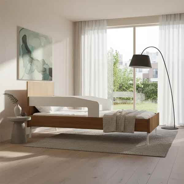 Cama con baranda Linnea. Estructura de melamina textura SERRANO con patas y baranda laqueadas en blanco. La cama Linnea cuenta con una baranda adicional para anexar cuando sea usada para niños chicos que aún están acostumbrados a la baranda de cunas o funcionales.