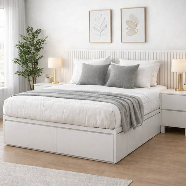 Fabricado en Laminado texturado con detalles laqueados en blanco, mesas de luz flotantes incluidas diseño minimalista Para colchones desde 140 a 170 de ancho.